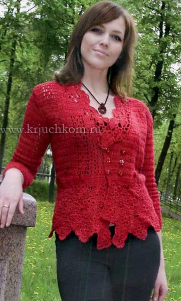 Красивый вязаный жакет с ажурной каймой выполнен крючком из ярко-красной пряжи.