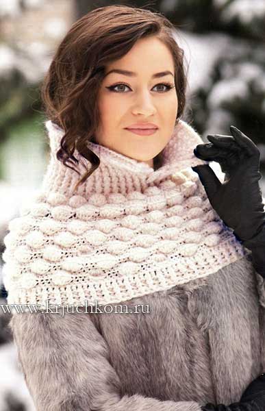 Теплый вязаный воротник выполнен крючком. Такая модель отлично дополнит ваш зимний наряд.