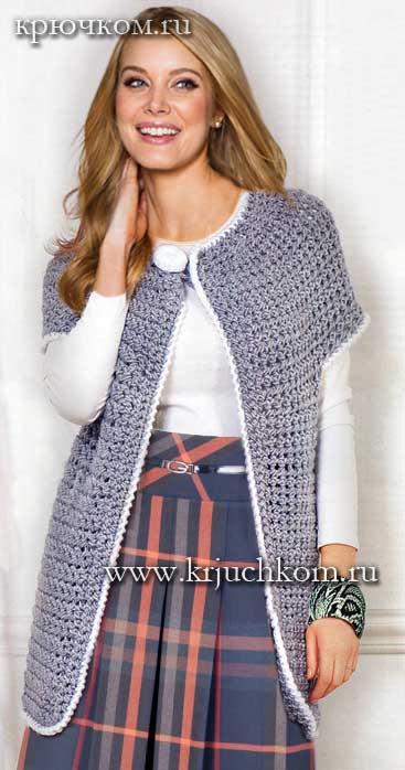Серый ажурный жилет связан крючком. Описание вязания со схемами.